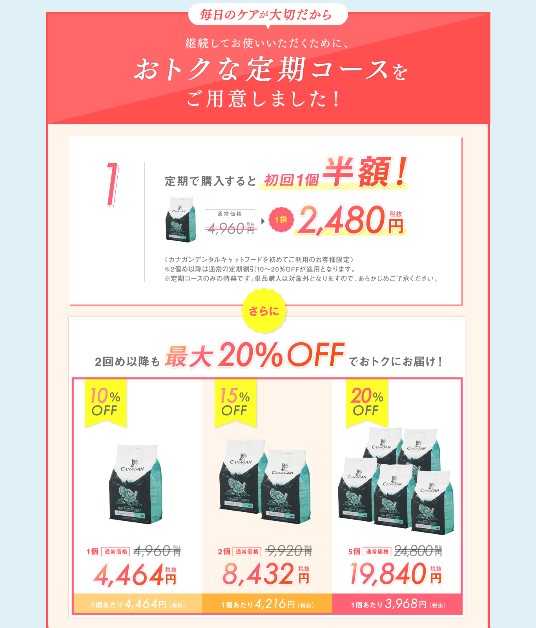 カナガンキャットフードを公式サイトの定期コースで購入すると1点からでも通常価格の10%オフで購入することが出来ます。